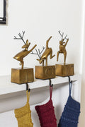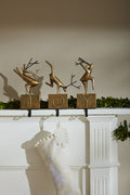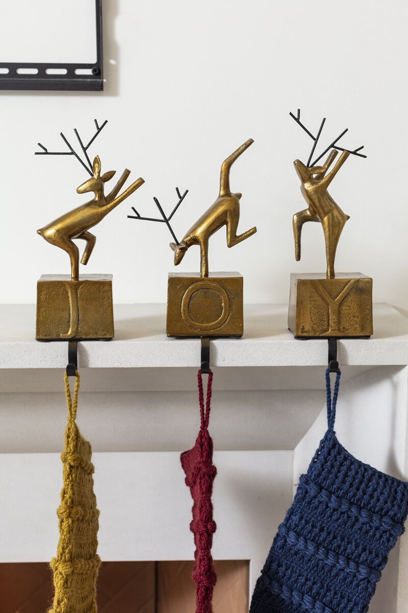 Jolly deer dance along the tops of the Jumping For Joy Stocking Holder set. Each gold metal holder has a festive dancing deer on top and a raised letter on the front, spelling out the word JOY.