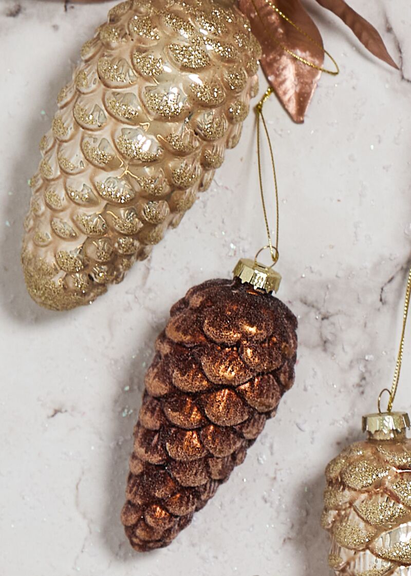 Decorate the Christmas tree with the Frosted Pinecone Ornament Collection, a nature inspired variety of sparkling pinecones in pink, gold, and bronze. Each colorway comes in two sizes has a shiny glass base, dusted in color coordinating glitter. These pinecones come with a metallic string and are perfect on the tree or styled as bowl fillers as festive tabletop decor.